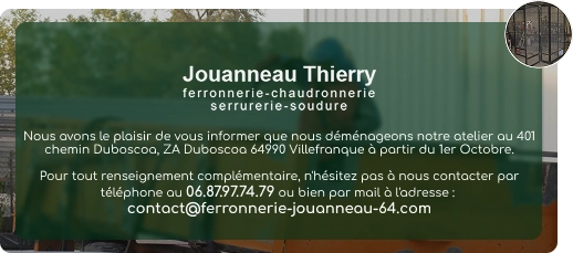 Artisan depuis 2004, je suis M. Jouanneau Thierry, votre chaudronnier ferronnier situé à Bayonne dans les Pyrénées-Atlantiques (64) : Je réalise des éléments en Fer Forgé tel que la fabrication de portails…